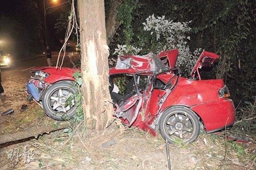 猛烈撞擊下車身呈形扭曲夾緊樹(shù)干。圖自香港..